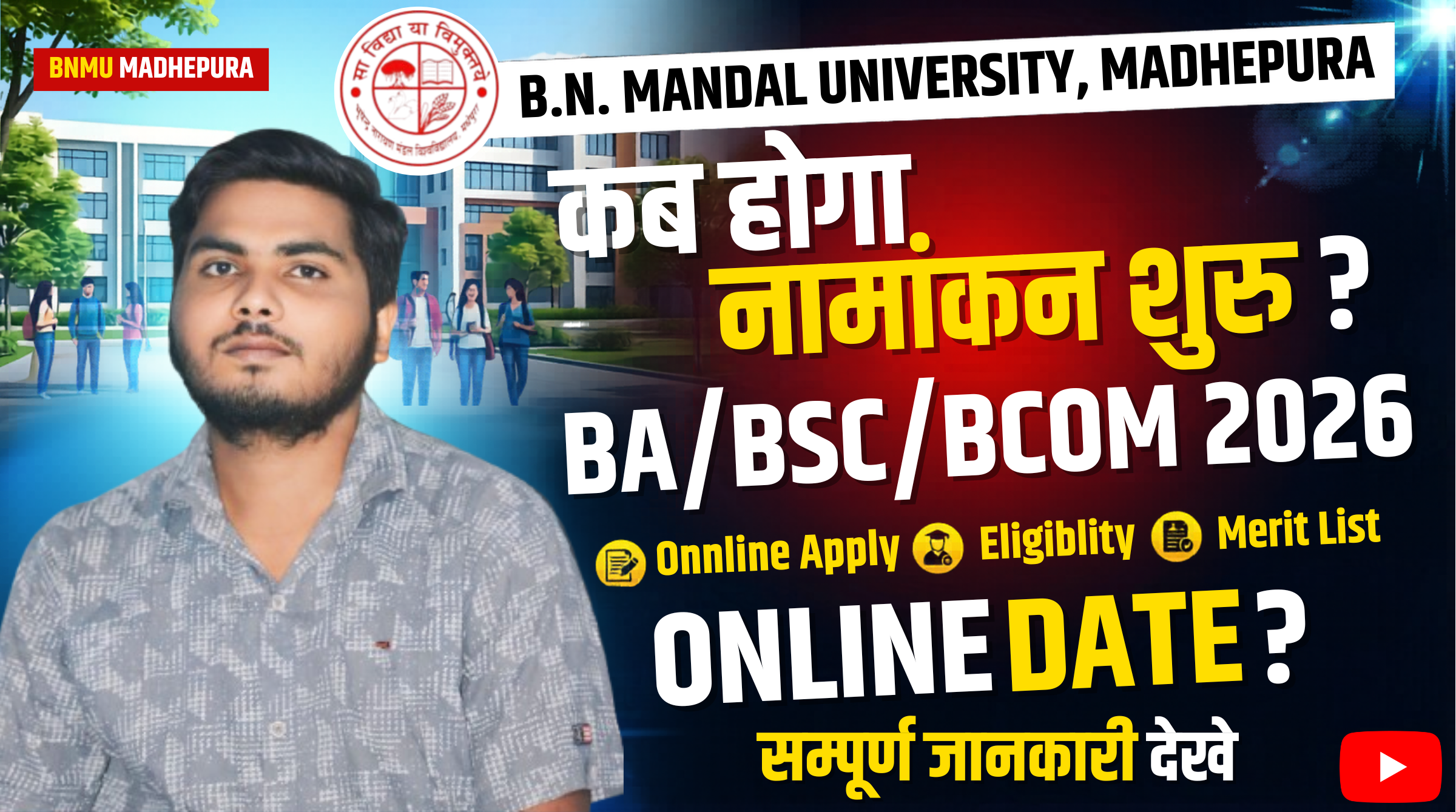 अगर आपने 2026 में इंटर पास किया है और भूपेंद्र नारायण मण्डल यूनिवर्सिटी मधेपुरा (BNMU) के अंतर्गत आने वाले तीनों जिलों (सहरसा, सुपौल और मधेपुरा) के कॉलेजों में स्नातक (BA/B.Sc/B.Com) सत्र- (2026-30) मे एडमिशन लेना चाहते हैं, तो यह पोस्ट आपके लिए है। यहाँ आपको ऑनलाइन आवेदन की तिथि, जरूरी डॉक्यूमेंट, योग्यता और फीस की पूरी जानकारी विस्तार से मिलेगी।