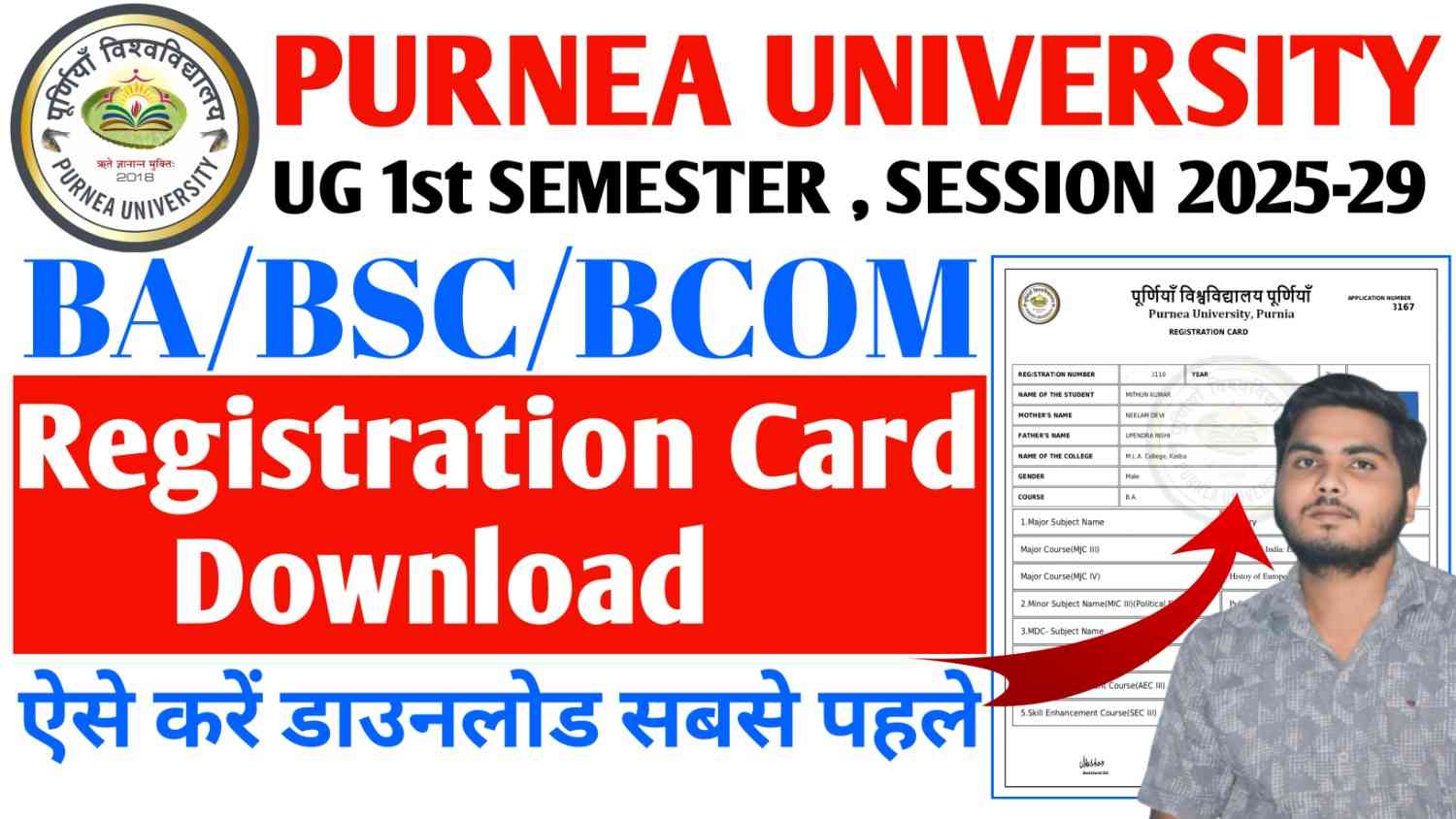 इस पोस्ट में हम आपको Purnea University UG 1st Sem Registration Card Download करने का सबसे आसान तरीका और डायरेक्ट लिंक देंगे। साथ ही अगर आपके कार्ड में कोई गलती है, तो उसे सुधारने की प्रक्रिया भी बताएंगे।