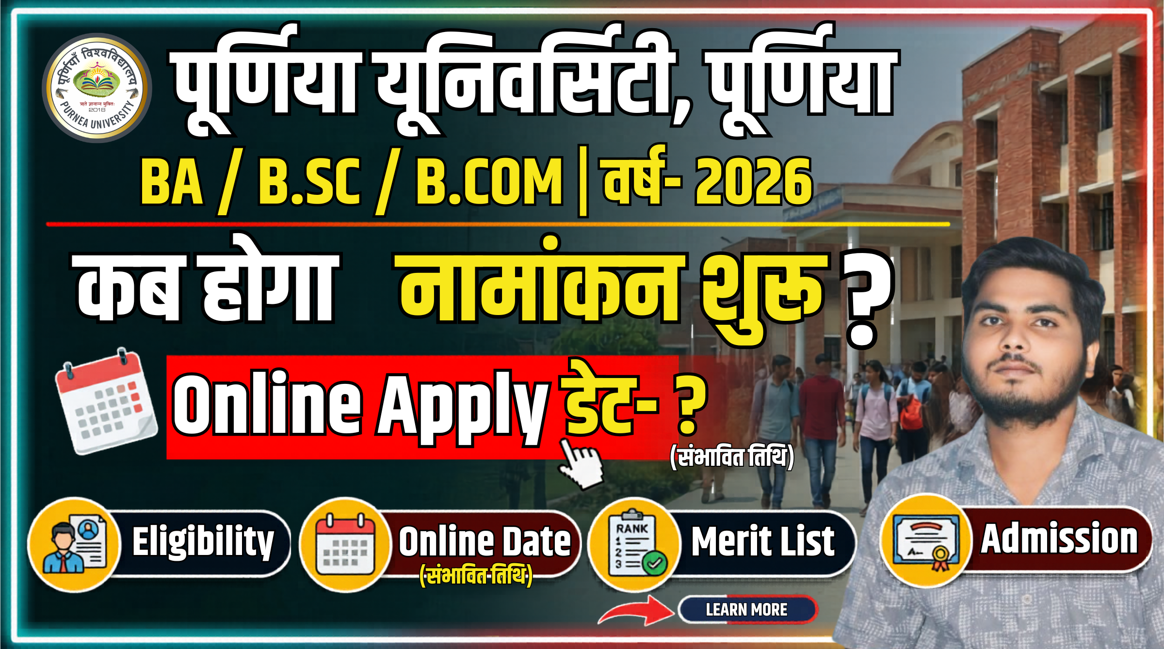 अगर आपने 2026 में इंटर पास किया है और पूर्णिया यूनिवर्सिटी के अंतर्गत आने वाले चारों जिलों (पूर्णिया, अररिया, कटिहार और किशनगंज) के कॉलेजों में स्नातक (BA/B.Sc/B.Com) सत्र- (2026-30) मे एडमिशन लेना चाहते हैं, तो यह पोस्ट आपके लिए है। यहाँ आपको ऑनलाइन आवेदन की तिथि, जरूरी डॉक्यूमेंट, योग्यता और फीस की पूरी जानकारी विस्तार से मिलेगी।