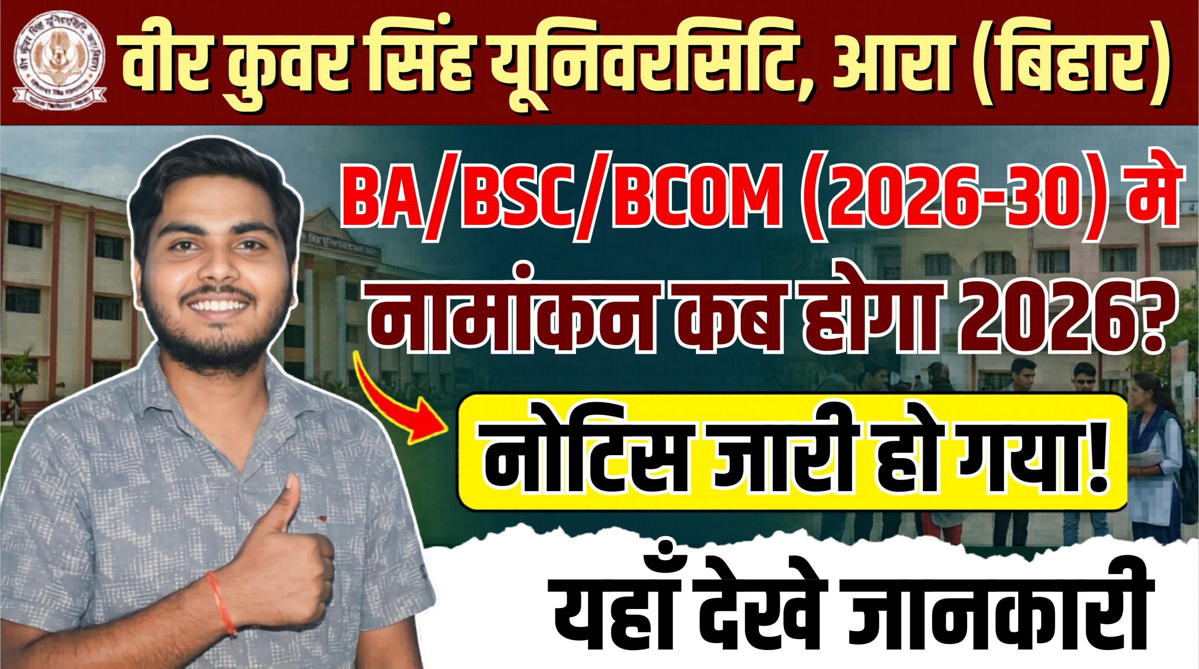 अगर आपने 2026 में इंटर पास किया है और वीर कुँवर सिंह यूनिवरसिटि आरा (बिहार) के अंतर्गत आने वाले चारों जिलों (भोजपुर, बक्सर, कैमूर और रोहतास) के कॉलेजों में स्नातक (BA/B.Sc/B.Com) सत्र- (2026-30) मे एडमिशन लेना चाहते हैं, तो यह पोस्ट आपके लिए है। यहाँ आपको ऑनलाइन आवेदन की तिथि, जरूरी डॉक्यूमेंट, योग्यता और फीस की पूरी जानकारी विस्तार से मिलेगी।